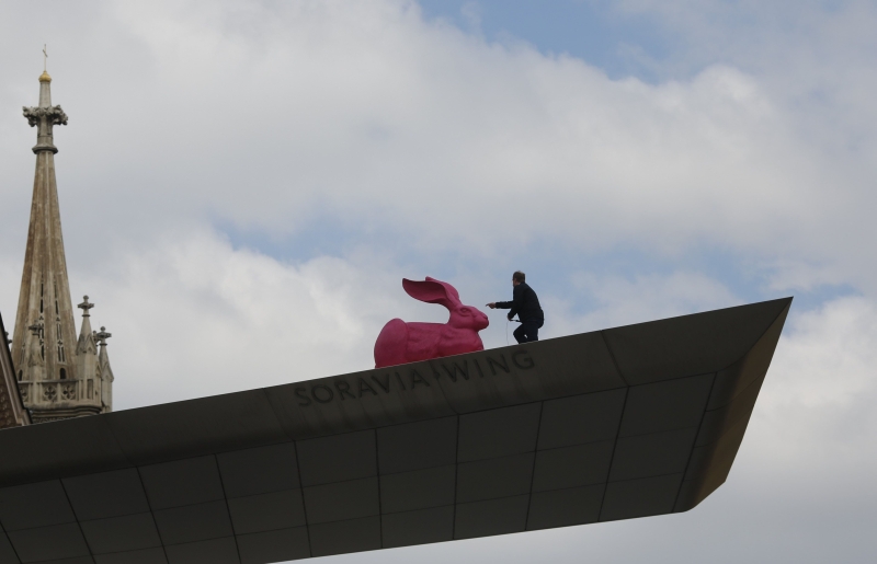 Uma réplica de plástico e pintada de rosa do coelho no quadro "Lebre Jovem", do pintor alemão renascentista Albrecht Duerer (1471-1528), foi colocada no topo do museu Albertina, em Viena, para promover a exposição As Origens do Albertina De Duerer a Napoleão, abrigada pela instituição vienense.
