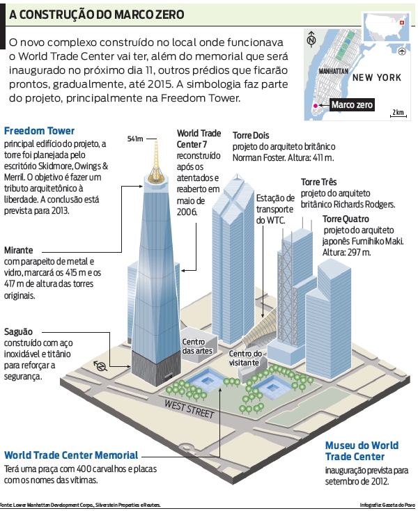 Uma nova torre ressurge, cheia de simbolismos. A Freedom Tower, edifício mais alto do complexo terá altura das antigas torres. E com uma antena instalada no topo, o prédio chegará a uma altura superior, de 541 m ou 1.776 pés (medida utilizada nos EUA), o número propositalmente coincide com o ano de independência dos Estados Unidos.