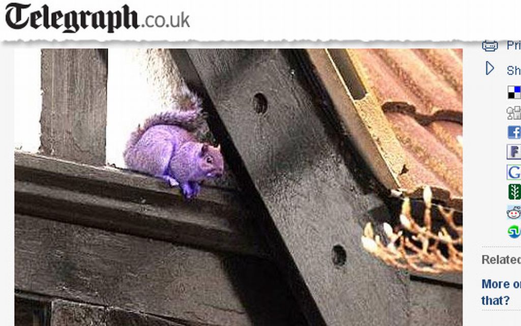 Um esquilo roxo, que foi apelidado de Pete, tem chamado atenção de alunos e professores em uma escola de Stubbington, na Inglaterra, segundo o jornal inglês "The Daily Telegraph".