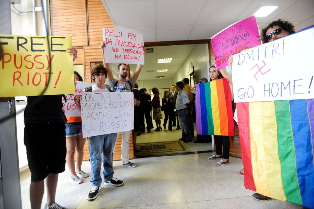 Estudantes de Brasília organizaram um protesto nesta terça-feira (19) para pedir a liberdade das integrantes do grupo musical russo Pussy Riot às vésperas da visita do primeiro-ministro da Rússia, Dmitri Medvedev, ao Brasil.