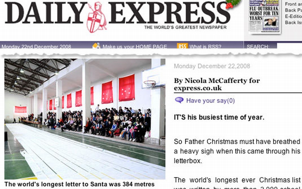Segundo o "Daily Express", o antigo recorde de carta mais longa enviada ao Papai Noel pertencia a 495 crianças de Rumford, nos Estados Unidos, que haviam enviado uma carta de 27 metros para o bom velhinho.