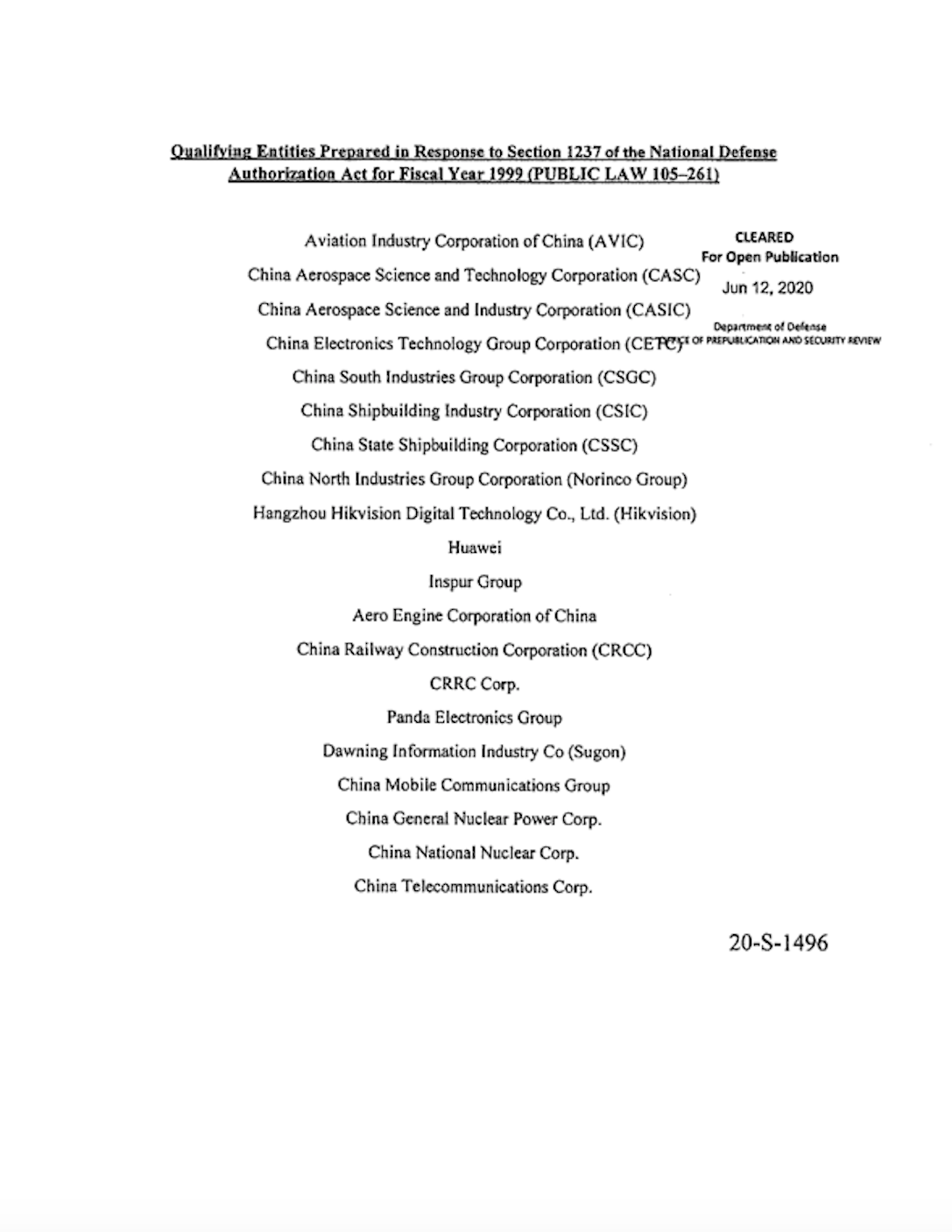 A relação foi incluída como parte de uma disposição sobre a autoridade do presidente de aplicar a Lei de Poderes Econômicos Internacionais de Emergência (IEEPA) a empresas vinculadas ao exército chinês que operam nos EUA.