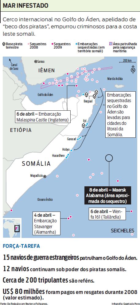 Atacado a cerca de 450 km da costa somali, o cargueiro Maersk Alabama foi o primeiro navio de bandeira americana tomado por piratas em dois séculos um rebocador italiano, pertencente a uma companhia dos Estados Unidos, foi sequestrado em águas somalis, as mais perigosas para o comércio internacional.