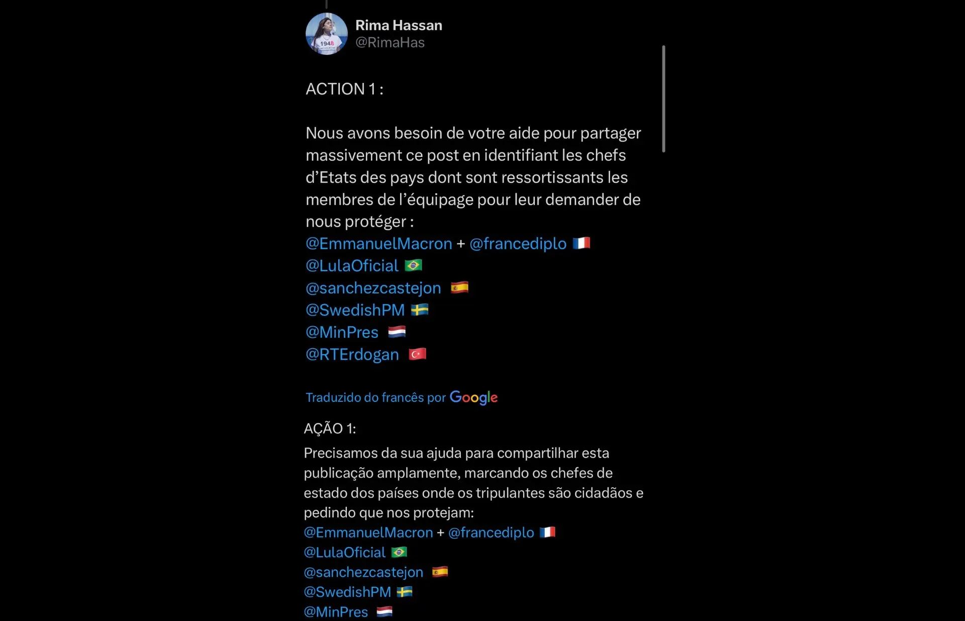 “Precisamos da sua ajuda para disseminar amplamente esta mensagem, identificando os líderes dos países cujos cidadãos fazem parte da tripulação e pedindo proteção”, escreveu Rima Hassan.