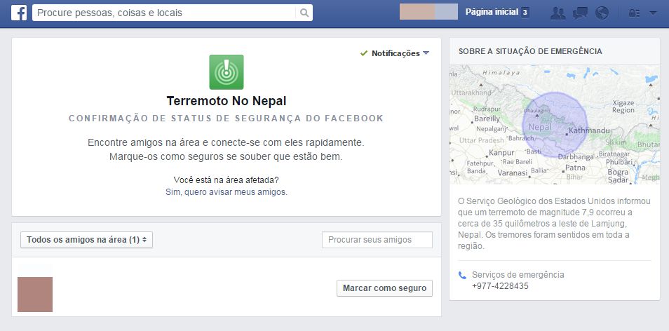 As pessoas que estão na área receberam uma notificação do Facebook, perguntando se está tudo bem, e se elas gostariam de informar isso aos seus amigos.