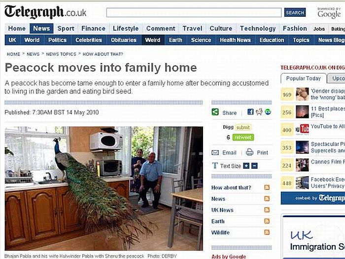 Uma família de Derbyshire, na Inglaterra, abriu as portas de sua casa para que o pavão de estimação passasse a desfrutar dos outros cômodos.
