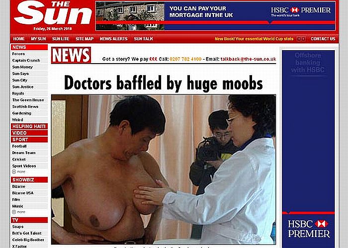 Guo Feng, de 53 anos, foi considerado pelos médicos chineses o homem com as maiores mamas do mundo. O fazendeiro está à procura de uma solução para seu problema.