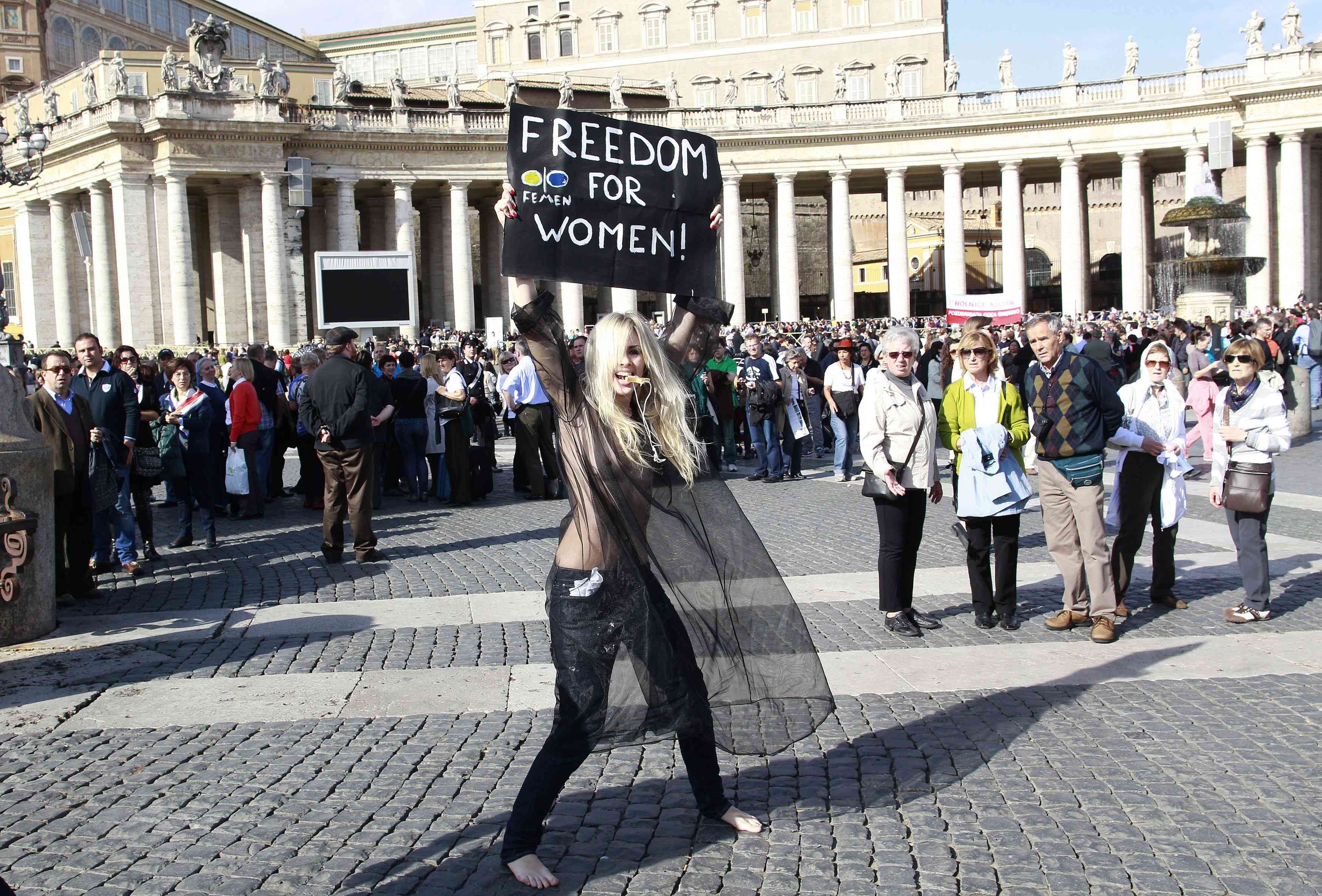 Uma das cinco jovens, uma loira alta vestida com uma calça jeans apertada e uma espécie de blusa transparente, conseguiu chegar até a praça e remover a parte de cima da vestimenta, surpreendendo fiéis e turistas.