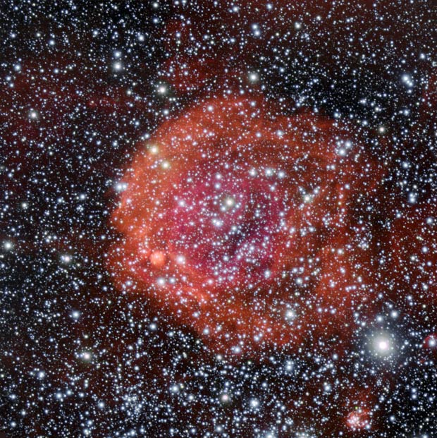 Trata-se de uma região onde estrelas são criadas constantemente. Boa parte do hidrogênio disponível no local é usado para a geração de novos astros luminosos e a camada vermelha da foto mostra os restos de gás no aglomerado.