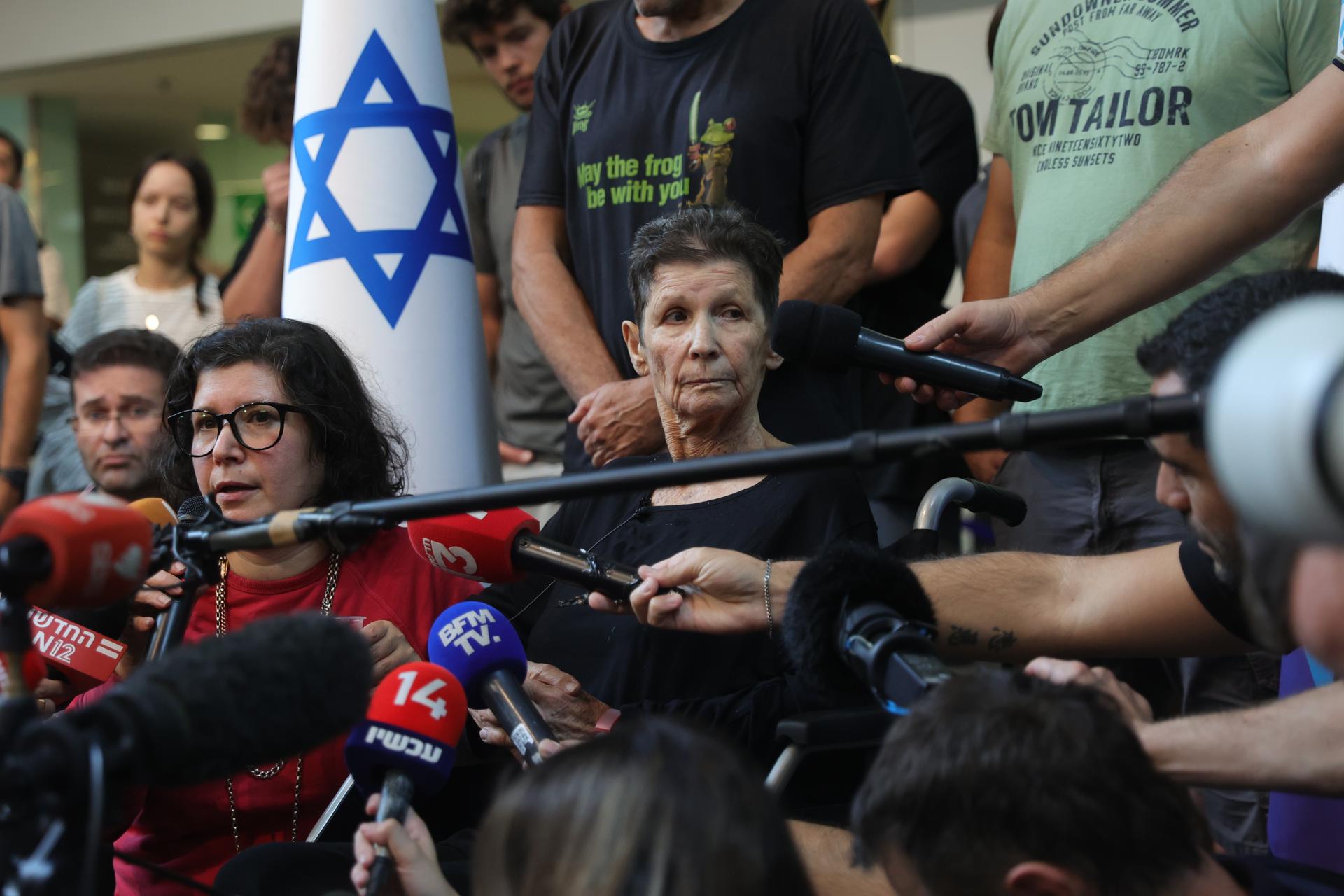 Visivelmente abalada, a vítima afirma que foi agredida por terroristas em um cativeiro na Faixa de Gaza. “Me levaram, com as pernas de um lado e a cabeça do outro, em uma motocicleta. Fui agredida com pedaços de pau”, disse a idosa, sentada em uma cadeira de rodas durante a coletiva de imprensa.