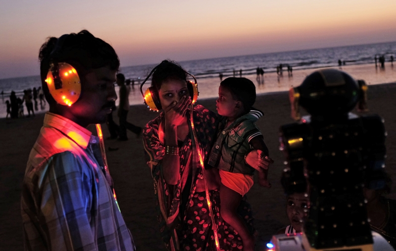 Mulher reage ao ouvir seu futuro em uma "máquina de adivinhação" instalada numa praia do Mar Árabe em Mumbai, na Índia.