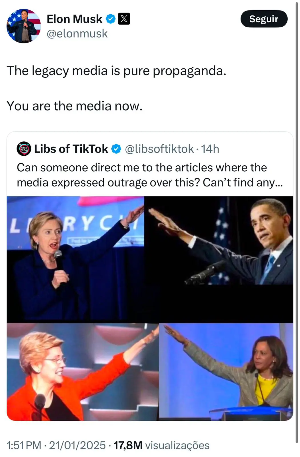 Após sofrer críticas por parte da imprensa e de usuários de redes sociais em razão de gesto comparado a saudação nazista, Elon Musk, novo chefe do Departamento de Eficiência Governamental (DOGE), criticou a imprensa: "A mídia tradicional é pura propaganda. Você é a mídia agora".