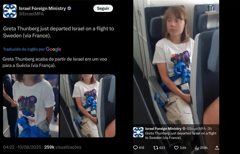 “Greta Thunberg acaba de decolar de Israel em um voo para a Suécia (via França)”, disse a pasta, que também publicou duas imagens nas redes sociais da ativista a bordo de um avião no Aeroporto Internacional Ben Gurion. Ela é conhecida por seu ativismo climático e há um tempo evita viagens aéreas.