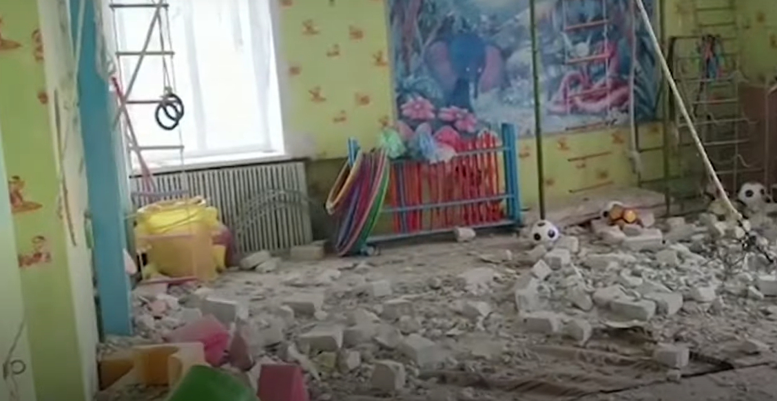 Imagens de vídeo divulgadas pela polícia ucraniana mostraram um buraco em uma parede de tijolos em uma sala repleta de detritos e brinquedos infantis. Outra fonte mostra equipes de emergência escoltando crianças pequenas e professores de um prédio.