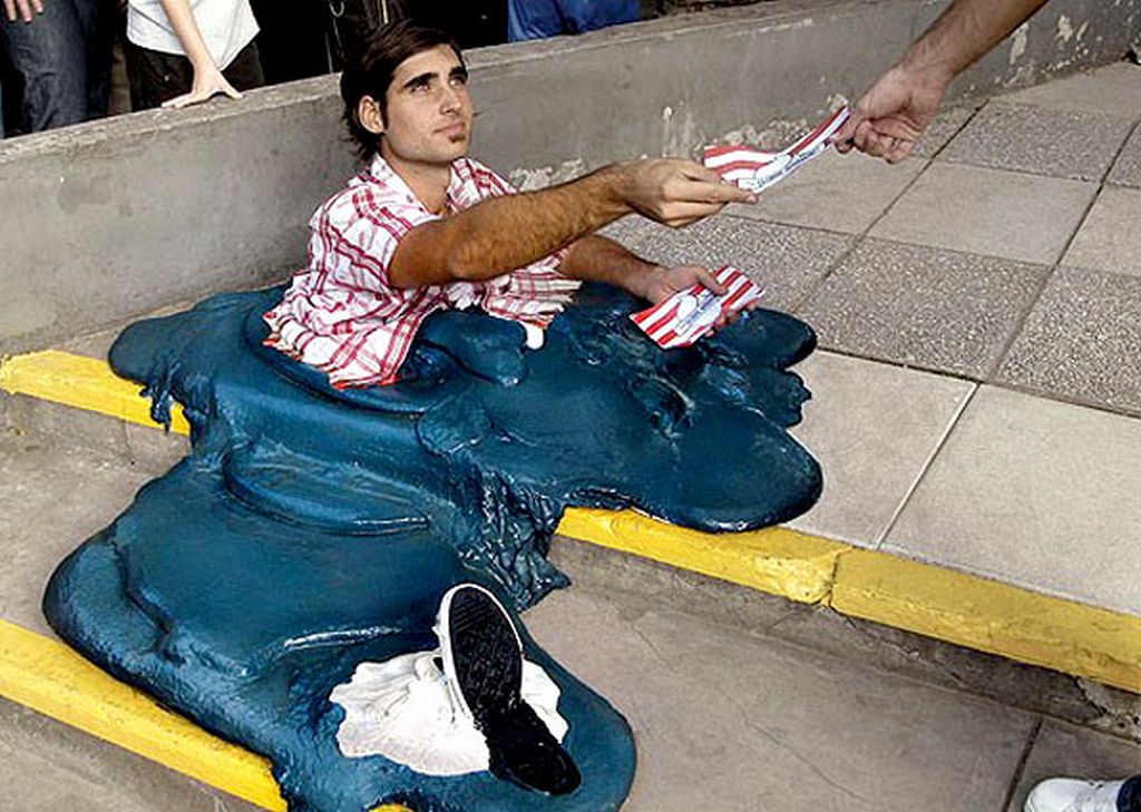 Um homem resolveu mostrar os efeitos do aquecimento global de uma maneira criativa em uma calçada de Buenos Aires. Em uma ação da Cruz Vermelha da Argentina, o "homem-derretido" distribuiu folhetos com dicas de como economizar energia.