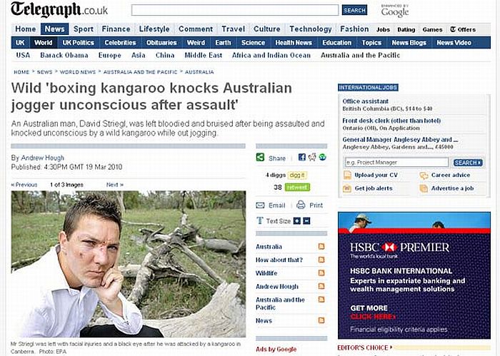 David Striegl, de 25 anos, estava fazendo seus exercícios matinais quando foi atacado por um canguru e nocauteado pelo animal em Canberra, capital da Austrália.