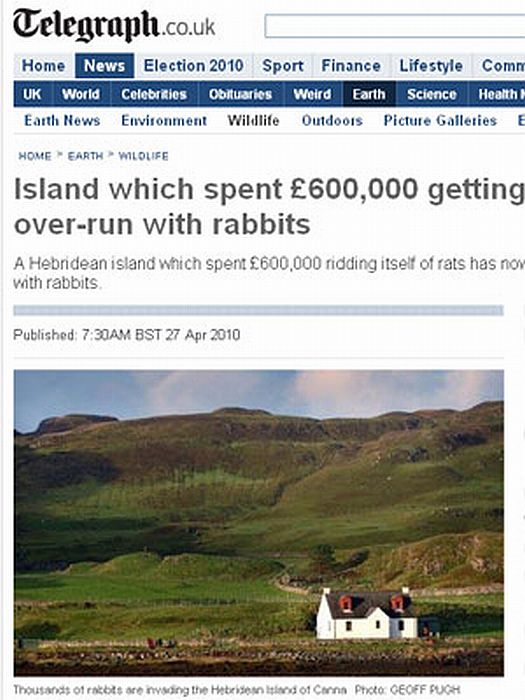 Entretanto, desde 2006 o número de coelhos vem aumentando desenfreadamente na ilha. Com a falta de ratos para espantá-los, os animais estão se espalhando por Canna.
