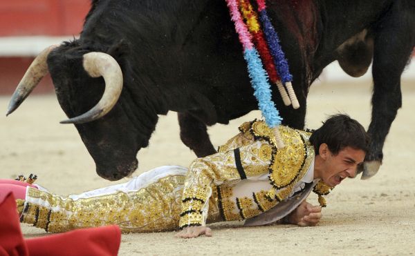 Ferido na arenaFoto mostra o momento em que o toureiro Tomasito, da cidade de Arles, na França, é chifrado por um touro da casa Garcigrande durante festival na arena da cidade francesa. Ele ficou ferido na coxa direita, foi operado e passa bem. Em entrevista após o incidente, disse: "Os touros são a minha vida."