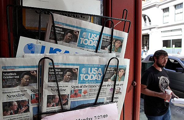 Banca exibe jornais em São Francisco, na Califórnia. Depois de vários anos de queda nas receitas e cortes maciços de pessoal, as empresas jornalísticas dos EUA tiveram ontem uma boa notícia para informar aos seus leitores. A companhia Gannett, a maior editora de jornal do país e proprietária do USA Today, divulgou lucro no terceiro trimestre do ano.