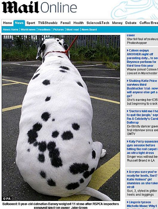 Um inglês foi proibido de ter bichos de estimação por 10 anos depois que seu dálmata chegou a pesar 70 quilos, segundo reportagem do jornal "Daily Mail". John Green, de 50 anos, deixava o Barney comer salgadinhos e chocolate.