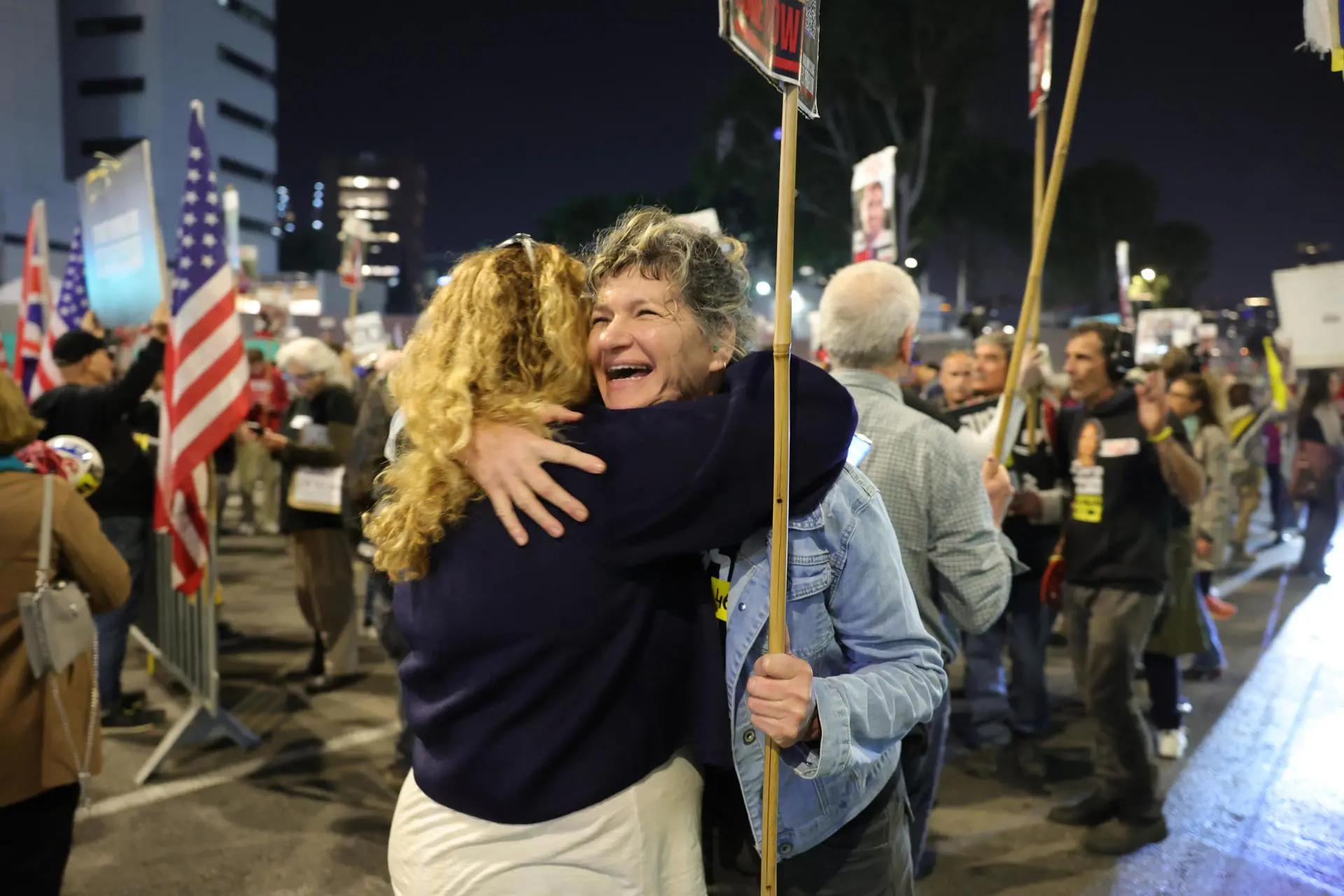 Centenas de pessoas se reuniram do lado de fora de uma sede militar na cidade. Alguns seguravam cartazes de reféns mantidos pelo Hamas no enclave palestino desde o dia 7 de outubro de 2023, enquanto outros levantavam velas no ar.