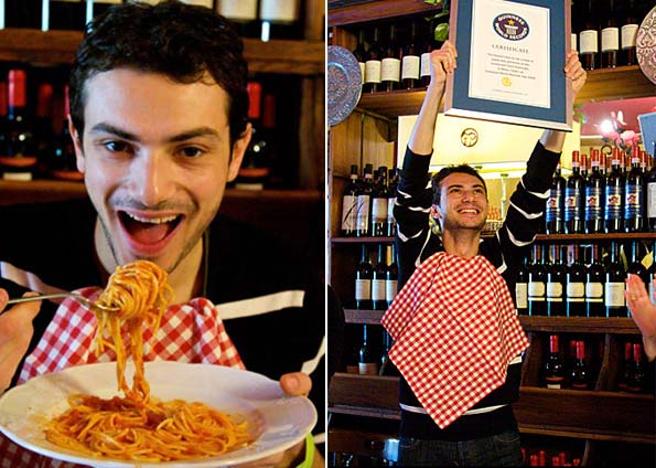 O italiano Ernesto Cesario entrou para o Guinness Book, livro dos recordes, por comer um prato de espaguete em um minuto e 30 segundos.