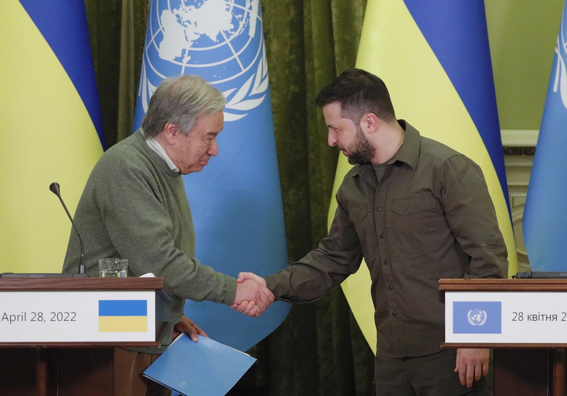 Guterres, que se encontrou com o presidente ucraniano, Volodymyr Zelensky, enfatizou durante entrevista coletiva que a ONU está “comprometida em ajudar o povo ucraniano nesta situação dramática”.