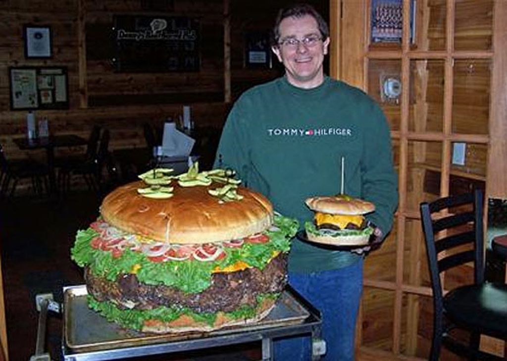 Para quem frequenta a lanchonete Denny's Beer Barrel, em Clearfield, Pensilvânia, o sanduíche de 4 kg produzido em Sorocaba parece um aperitivo. Denny Liegey, dono do estabelecimento, diz ser responsável pelo maior hambúrguer do mundo: são 55 kg. Cada sanduíche é vendido por US$ 370. Ele mostra, ao lado, a versão mais 'light', de apenas três quilos.