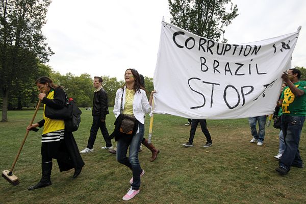 Seguindo a onda de protestos que se espalha pelo mundo, um pequeno grupo de brasileiros que vivem em Londres resolveu fazer ontem na cidade inglesa a Marcha Contra a Corrupção no Brasil. A manifestação, autorizada pela polícia, teve início em frente da Embaixada do Brasil e seguiu pela Richmond Terrace, próximo ao Parlamento Britânico. A liderança foi da brasileira Solange Leiroz, que vive no Reino Unido há 18 anos. Assim como no Brasil, o movimento foi organizado por meio de redes sociais e também utilizou a vassoura como símbolo para "varrer" a corrupção.