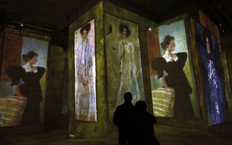 Visitantes assistem ao espetáculo de luzes e som Klimt e Viena, um Século de Ouro e Cores, parte do tradicional evento Catedral das Luzes, realizado em Les Baux-de-Provence, na França. O espetáculo de multimídia leva os espectadores a uma viagem por 100 anos de pintura vienense apresentando obras do artista austríaco Gustav Klimt e daqueles que o inspiraram. A ideia foi lançada em 2012 e a cada ano homenageia um artista diferente.