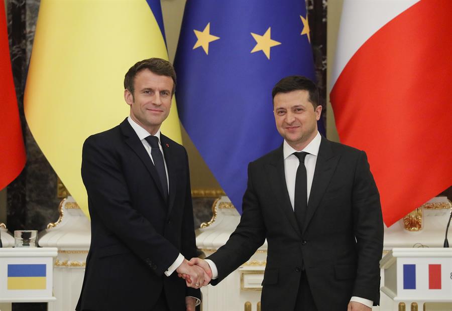 O presidente francês prometeu apoio para proteger a Ucrânia e os aliados europeus e classificou o ataque russo de "um ponto de virada na história da Europa".