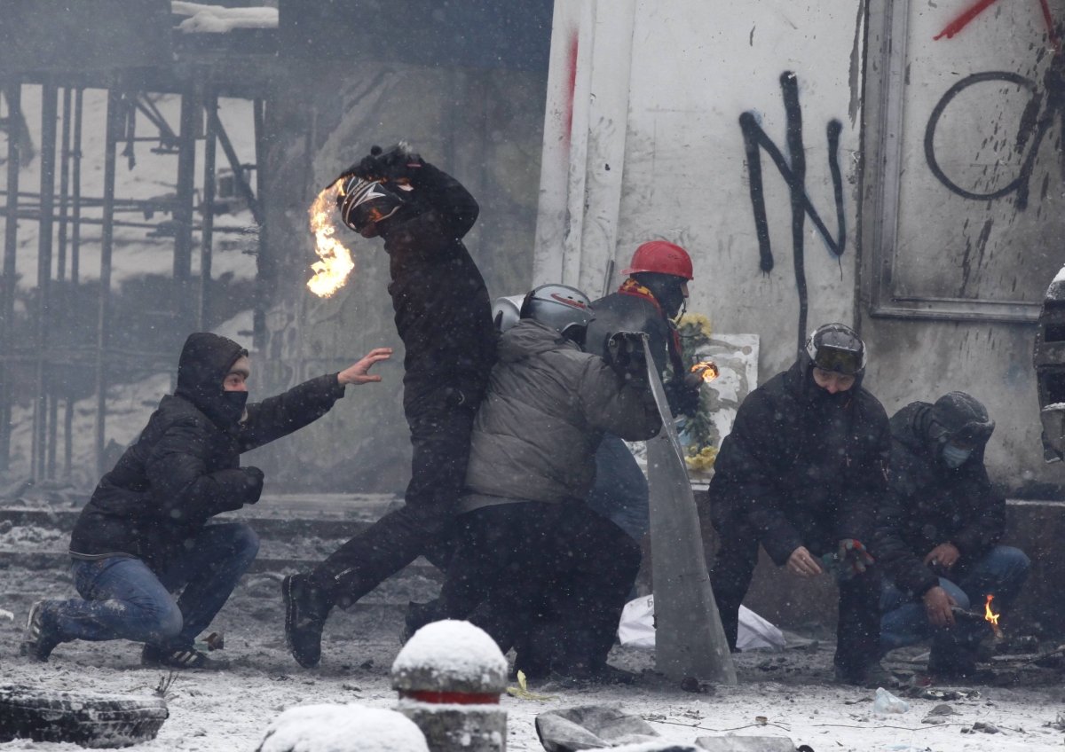 Em vários vídeos, feitos em dezembro no Maidán (praça) de Kiev, se veem grupos de ativistas encapuzados e mascarados, cercados por outros enfurecidos e armados com paus e cassetetes.