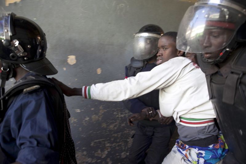 Trabalhadores dos serviços de resgate socorreram um homem que estava inconsciente depois de ter sido atingido por uma bala de borracha. Nos últimos dias tem havido choques entre a polícia e os manifestantes que tentam desafiar a proibição de fazer protestos contra o plano do presidente Abdoulaye Wade de tentar se reeleger para um terceiro mandato na presidência do país.