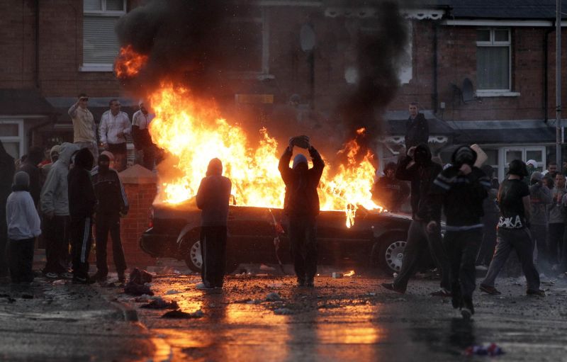 Pelo menos um carro foi incendiado, e dezenas de balas de efeito moral foram disparadas. A polícia estima que cerca de 500 passeatas tenham sido realizadas no território, a maioria de forma pacífica, embora tenham ocorrido confrontos isolados em outras áreas de Belfast.