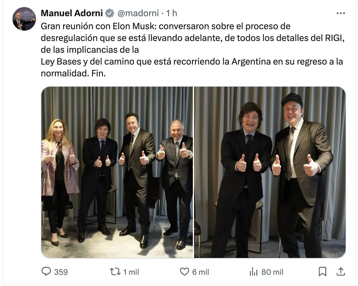 De acordo com Manuel Adorni, porta-voz do governo da Argentina, a reunião de Milei com Elon Musk foi um “grande momento”. Adorni disse por meio de publicação no X que ambos conversaram sobre o processo de desregulação que está em andamento na Argentina, o regime de incentivos para grandes investimentos (RIGI) e as implicações da Lei de Bases, bem como sobre o "caminho que a Argentina está percorrendo em seu retorno à normalidade". A postagem foi acessada pela Gazeta do Povo a partir de uma conexão de fora do Brasil.