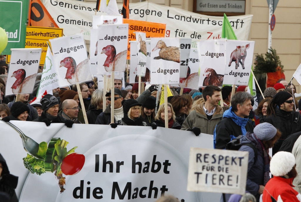Milhares de manifestantes protestaram em Berlim no sábado (22) para exigir uma mudança nos métodos de criação de animais e para mostrar a sua raiva por causa de um escândalo causado pela dioxina, uma substância cancerígena, que foi encontrada em alguns ovos, aves e suínos.