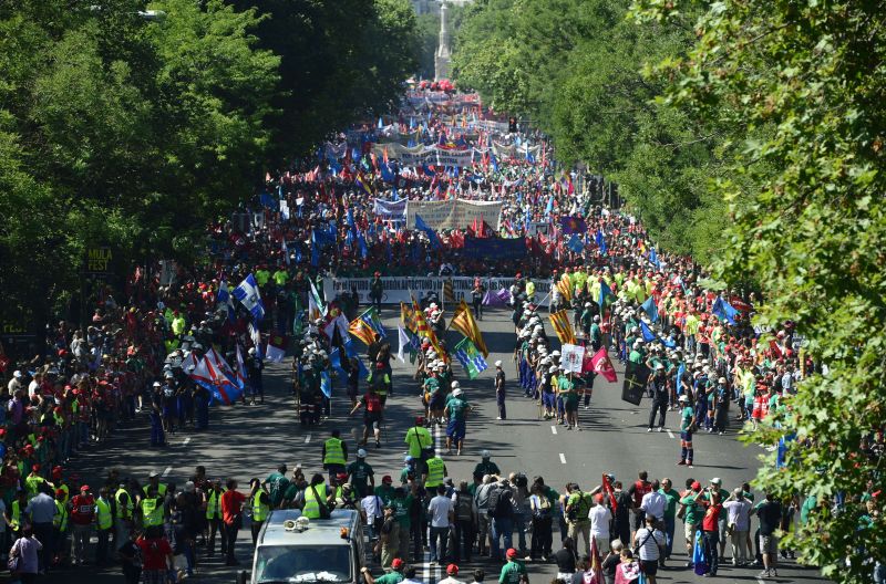 Centenas de mineiros, em greve desde maio, chegaram na terça-feira a Madri, depois de uma caminhada de mais de 400 quilômetros a partir do norte da Espanha, para participar na manifestação, na qual os sindicatos esperavam reunir 25.000 pessoas.
