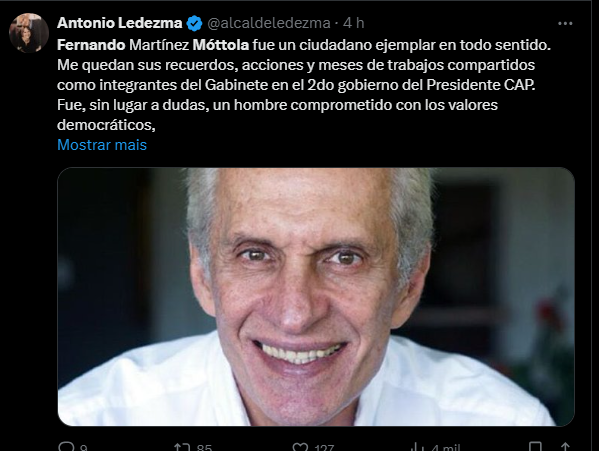 O partido Voluntad Popular, que faz oposição ao regime chavista, também prestou homenagem ao ex-ministro: "Com profundo pesar, nos unimos para render homenagem a nosso querido amigo e companheiro, Fernando Martínez Mottola, que dedicou sua vida ao serviço público e à defesa da democracia na Venezuela", publicou a sigla em suas redes sociais.