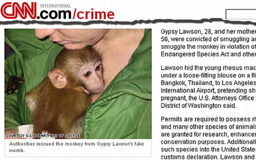 Lawson escondeu o jovem macaco reso dentro de sua blusa durante o vôo entre Bangcoc e Los Angeles. Às autoridades tailandesas e comissários de vôo, ela afirmou que estava grávida.