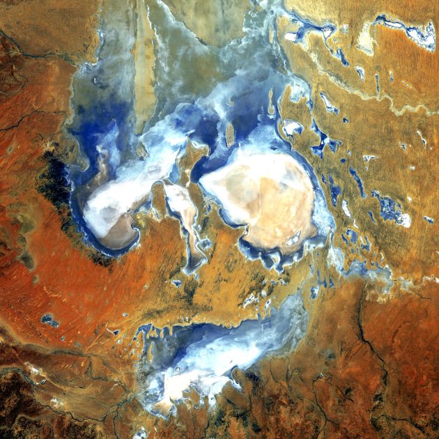 O rosto assustador nesta imagem são, na realidade, os bancos de areia do lago. O Lago Eyre é o maior da Austrália, quando ele está cheio. No entanto, nos últimos 150 anos, encheu completamente apenas três vezes. A imagem foi registrada em 05/08/2006.