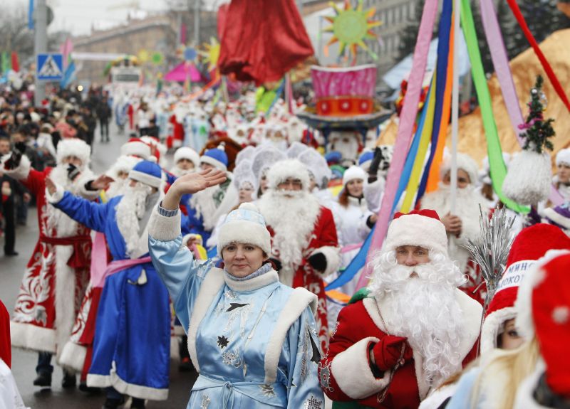 Cerca de 600 pessoas vestidas como Papai Noel e Mamãe Noel participam da procissão pela praça central em Minsque, na Bielorússia (Foto: Fedosenko Vasily / Reuters)