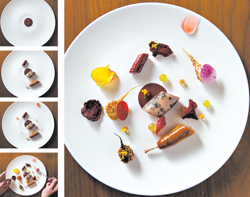 No Atera, Matthew Lightner supervisionava o meticuloso empilhamento do que parecia ser um botão de rosa monocromático. As pétalas eram compostas de lascas de amêndoa, mexilhões e alho em conserva. Paul Liebrandt, chef do Elm, montou um quadro surrealista com pombo, beterrabas, flores de estragão e pequenas pinceladas de suco rosa de maçã selvagem. Liebrandt, cujo mis-en-place está exposto em seu novo livro, "To the Bone", disse que o impressionante e complexo prato foi inspirado nos sabores do outono.