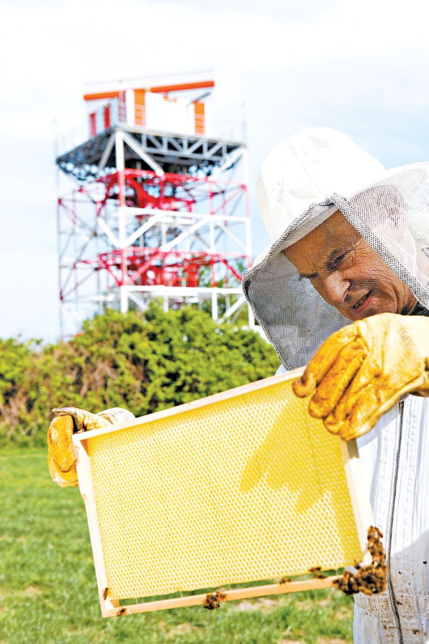 Um jato taxiou em uma pista próxima, e o rugido dos motores misturou-se ao zumbido de milhares de asas. Com a cabeça coberta por um véu de apicultor, Alexandre Beaudoin levantou um quadro de cria de uma das cinco colmeias, cada qual abrigando 70 mil abelhas.