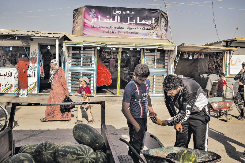 Um jovem comerciante sírio parou na barbearia de Ahmad Bidawi para um corte de cabelo. Em meio ao ruído dos ventiladores, ouvia-se música. Do lado de fora, na principal via comercial de um dos maiores acampamentos de refugiados do planeta, trabalhadores empurravam carrinhos de mão carregados de madeira e de eletrodomésticos, abrindo caminho entre as pessoas aglomeradas diante das lojas.