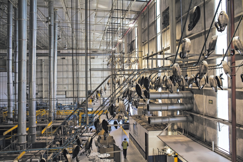 Em sua fábrica em Ohio, Sauey aponta para uma enorme máquina de US$ 2 milhões com braços robóticos, que transforma matérias-primas de plástico rígido em caixas para materiais de arte. A fábrica no México tem muito mais empregados cerca de 480, com salário de US$ 17,70 por dia e mais máquinas. Ambas as unidades vão gerar um faturamento de US$ 28 bilhões cada uma, de acordo com estimativas da companhia. Embora a fábrica de Ohio tenha como foco caixas de plástico de alta qualidade para guardar qualquer tipo de coisa, desde armas até remédios, a unidade de Saltillo fabrica produtos mais simples garrafas para detergente de para-brisas, ioiôs e chamarizes de caça.