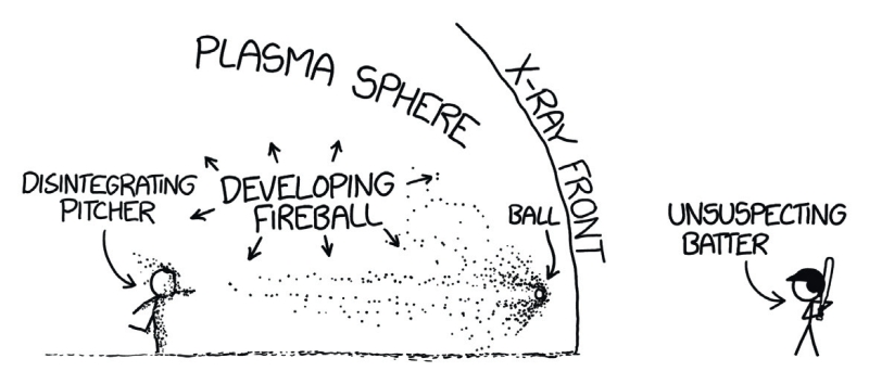 O que aconteceria se você tentasse rebater uma bola de beisebol lançada a 90% da velocidade da luz? "A resposta é muitas coisas, e todas acontecem muito rapidamente. Não termina bem para o batedor (nem para o lançador)."