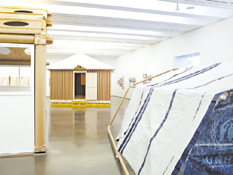 A exposição é comovente, com fotos e exemplos em escala real de barracas que ele criou para locais castigados no mundo todo, de Ruanda a Nova Orleans.