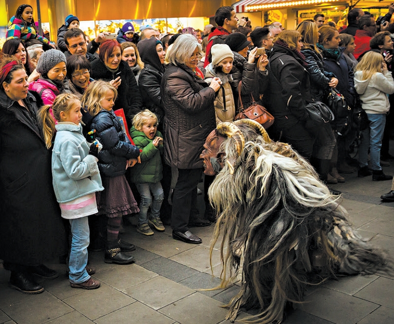 Algumas crianças se escondiam entre as pernas dos pais quando os personagens chifrudos começaram a correr entre a multidão puxando a aba do boné sobre os olhos dos garotos ou passando as garras pelos cabelos das mulheres; outras, mais corajosas, corriam atrás do Krampus ou Perchta que passava para lhes beliscar o pelo, rindo de prazer com os urros ou a ameaça de uma chicotada da besta-fera.
