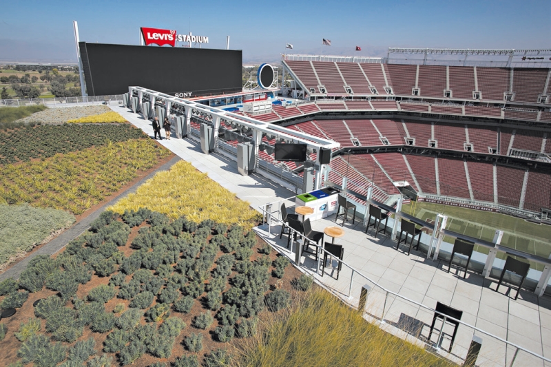 No Levis Stadium, em Santa Clara, na Califórnia, 85 por cento da água é reciclada. O Anschutz Entertainment Group, ou AEG, que administra dezenas de estádios ao redor do mundo, disse que já superou a meta de redução do consumo de água/pessoa em vinte por cento, número que deveria supostamente ser só alcançado em 2020. No Staples Center de Los Angeles, por exemplo, um dos mais movimentados do mundo, realizou uma auditoria e descobriu que cada um de seus 178 urinóis usava 166,560 mil litros/ano e ao substituí-los pela versão sem água, passou a economizar mais de 26,5 milhões de litros/ano e US$28.200.