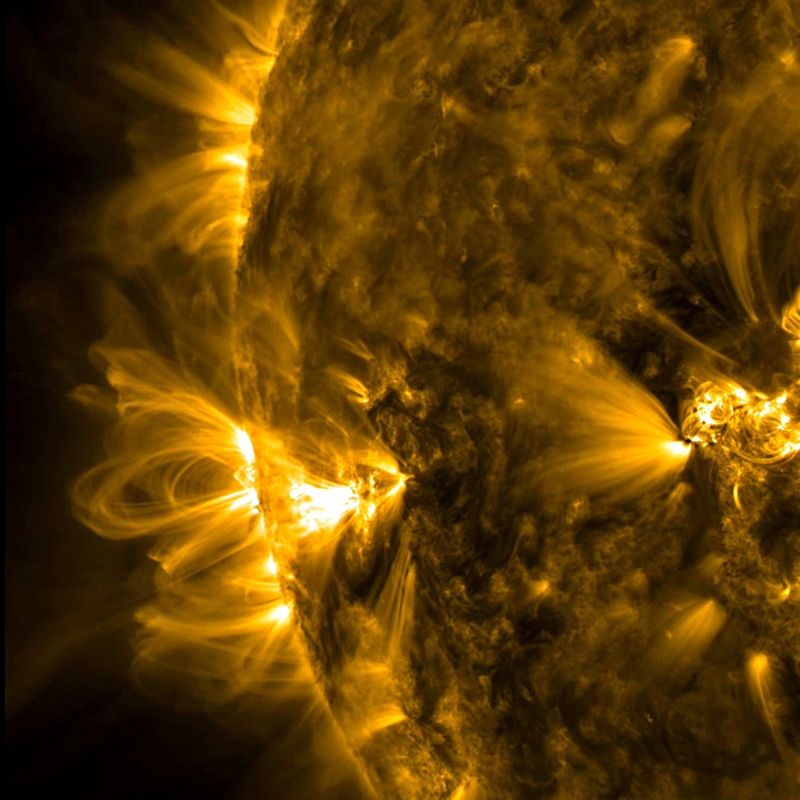 Imagem com luz ultravioleta captada ao longo de dois dias pela sonda Solar Dynamics Observatory (SDO), da Nasa, a agência espacial americana, mostra uma região de atividade dos chamados laços coronais, encontrados próximos a manchas solares. Essas estruturas estão associadas aos campos magnéticos na superfície solar. Alguns laços coronais duram dias ou até semanas, mas a maioria deles muda rapidamente.